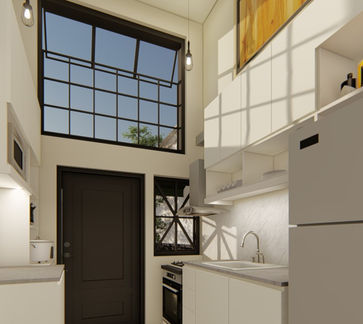 The C Residence is a modern, 2-level structure designed with 2 bedrooms, bathrooms, a kitchen, dining, an open ceiling, mezzanine, and front garden - all fit into a tiny, 80-sqm. space.