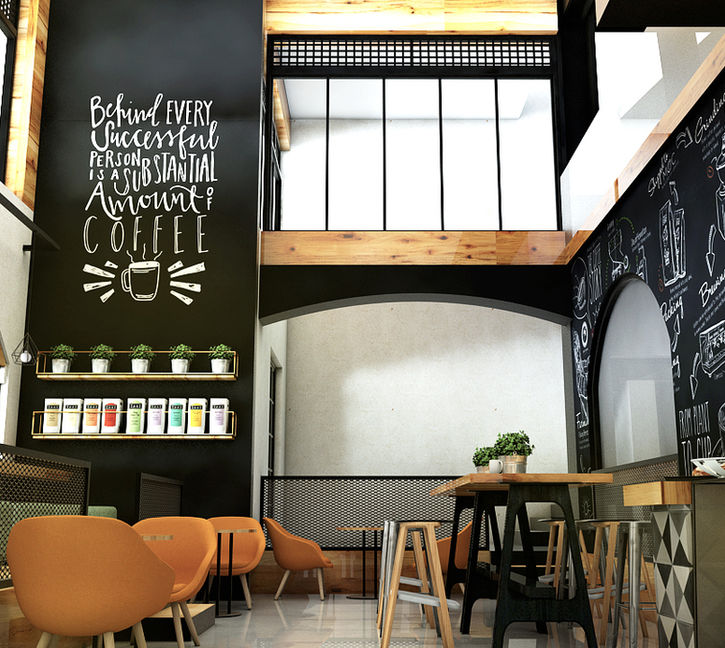 The café’s design features dark walls and ceilings in order to bring about the modernity of the space, while the wooden elements cater to the classic café look everyone loves. The wall text and illustrations also add an element of fun to the space.